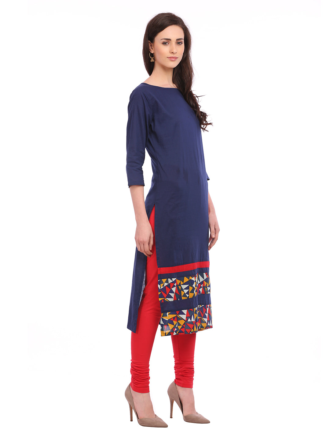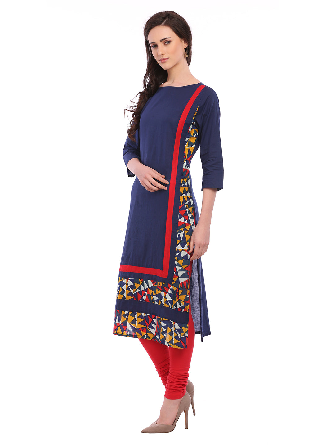 The solid red printed panel at the front creates a stunning contrast against the blue base, making it a perfect blend of tradition and modern flair. With its round neckline, 3/4th sleeves, and straight-fit silhouette, this piece flatters all body types and transitions beautifully from casual days to festive evenings.