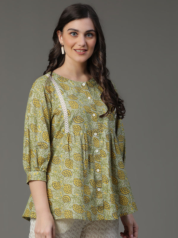 This cotton printed tunic-style kurta features puff sleeves with elegant cuff bands and a flattering V-neckline. Delicate lace work adorns the yoke, while gathers at the waist provide a graceful silhouette. Fabric-covered buttons run down the front, adding subtle sophistication to this expertly crafted piece. Ideal for combining comfort with style in versatile wear.