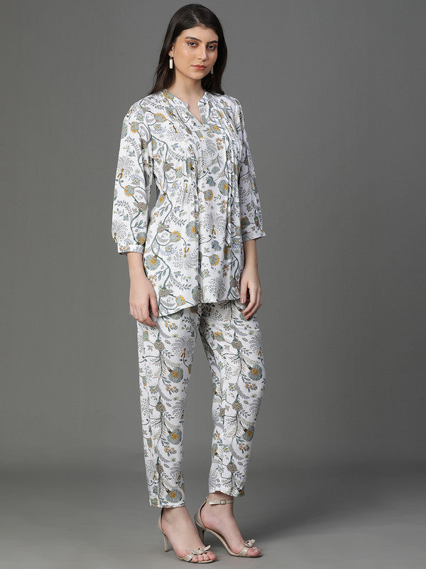 This elegant 2-piece coordinate set features a rayon printed kurta with intricate pintuck detailing on the front, bishop sleeves, and a neck band with a subtle V drop, enhanced by anchoring on the yoke for a refined finish. Complemented by matching rayon printed pants with an elastic waistband, this ensemble offers both comfort and style—ideal for sophisticated everyday wear or casual occasions.