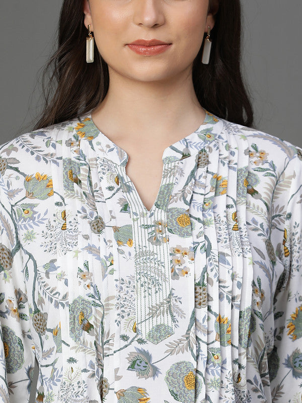 This elegant 2-piece coordinate set features a rayon printed kurta with intricate pintuck detailing on the front, bishop sleeves, and a neck band with a subtle V drop, enhanced by anchoring on the yoke for a refined finish. Complemented by matching rayon printed pants with an elastic waistband, this ensemble offers both comfort and style—ideal for sophisticated everyday wear or casual occasions.